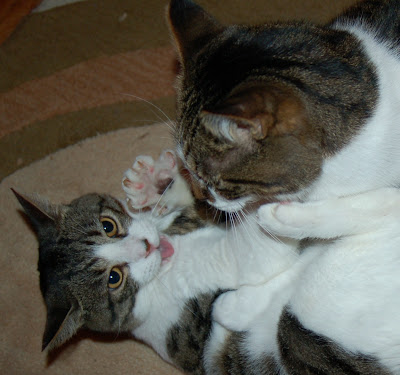 Well, because Thor had some sort of drama this morning. Not sure what, I was unpacking groceries, heard a blood curdling yowl, turned, saw Thor with his tail fluffed to FULL capacity stalking Loki. Loki was hissing and running, so I shut the door to separate them.